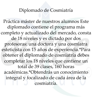 Nuestros Diplomados y Maestrías Diplomados Haga click en cualquier imagen o enlace para obtener más información. Cosmiatría Técnico Manicurista Integral Diplomado Superior de Masaje Estilista Integral Estético Dermocosmiatrico Técnico Quiropodista Preventivo Maestrías Haga click en cualquier imagen o enlace para obtener más información. Especialista en Cejas y Pestañas Experto en Peeling Químico Facial y Corporal